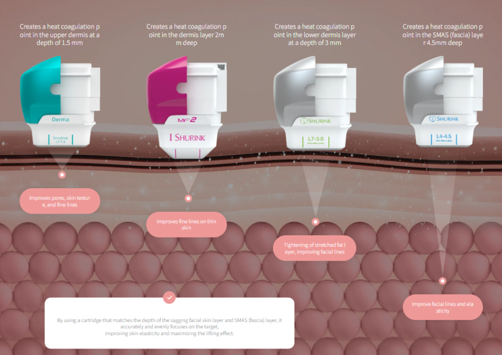 シュリンクは、1.5mmから4.5mmまで異なる深さに対応する複数の専用カートリッジを使い分けることで、部位や肌の状態に合わせたカスタマイズ治療が可能です。各層に応じた効果を最大限に引き出すためには、ターゲット層を正確に把握することが重要です。