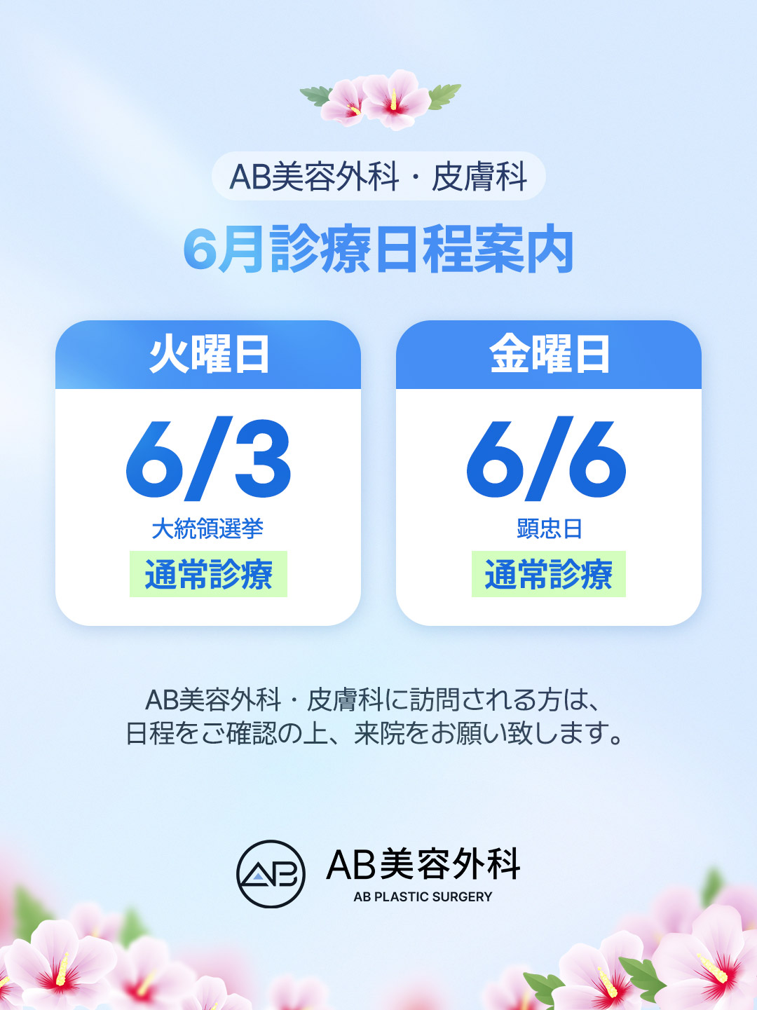 【AB美容整形外科】6月治療日程のお知らせ
