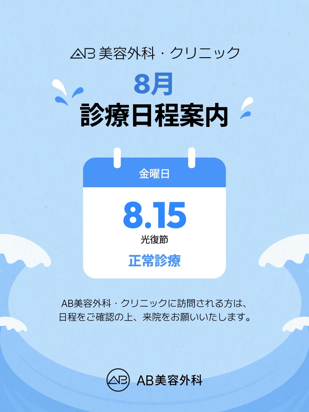 【AB美容整形外科】8月治療日程のお知らせ