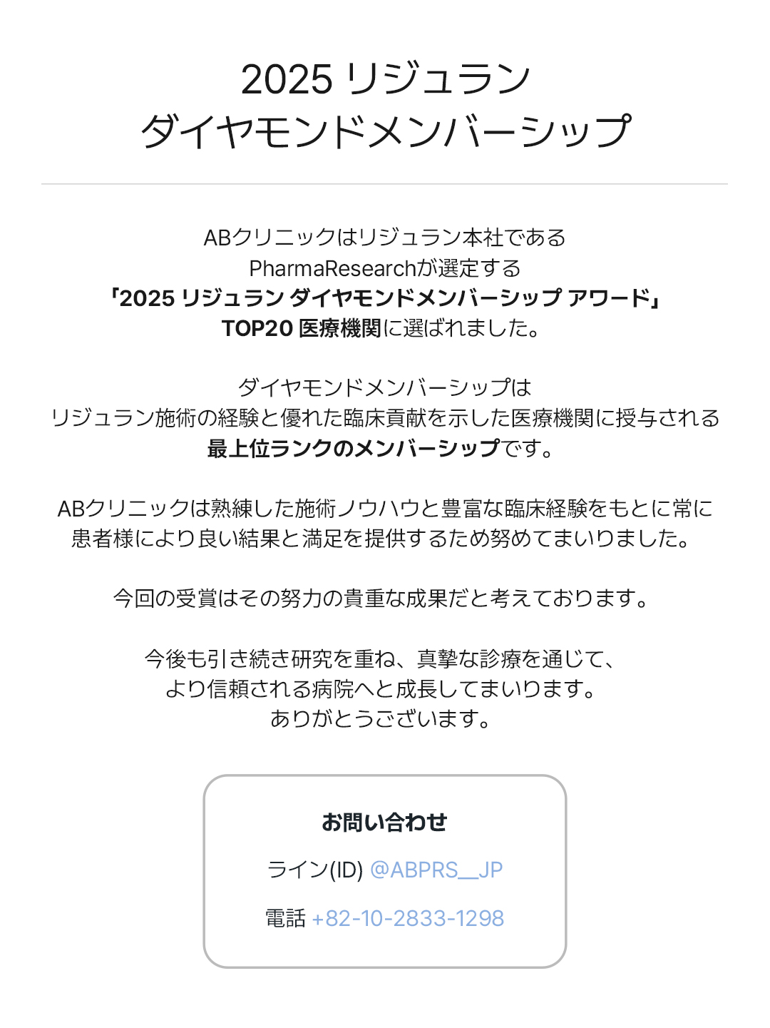 【AB美容整形外科】2025 リジュラン ダイヤモンドメンバーシップ受賞