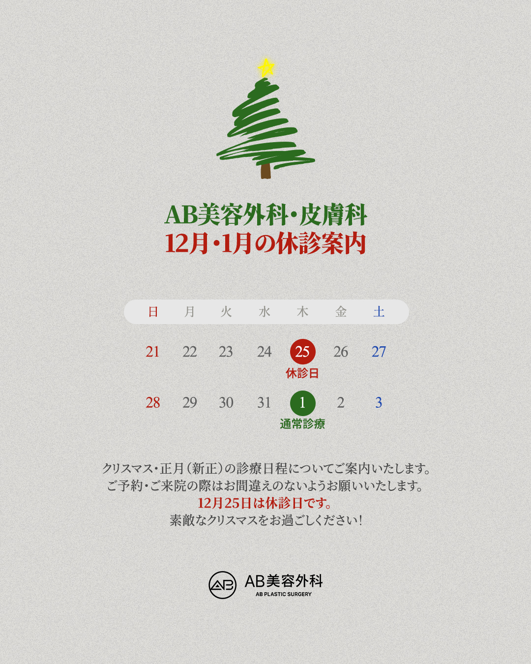 【AB美容外科】12月・1月/休診日のお知らせ