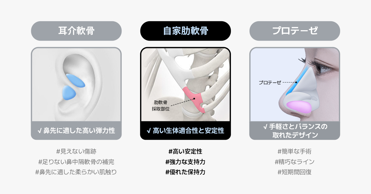 また、人体の軟骨の中で最も硬いため、形状維持力が優れており、時間が経っても吸収が少なく、持続力のある結果を望む場合に良い選択になります。