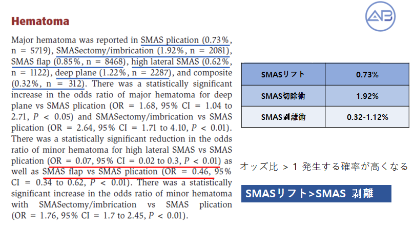 2. 血腫:手術後に血がたまる血腫の発生率はSMASリフト法で0.7%、SMAS切除術で1.9%、SMAS剥離術で0.85%でした。ここで興味深い点はオッズ比(odds ratio)を通して示されます。オッズ比はある事象が発生する確率を発生しない確率で割った値であり、この値が1より高ければ発生する確率が高いとお考えください。