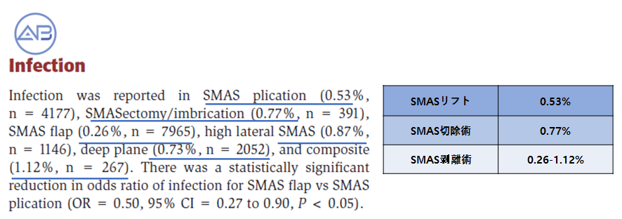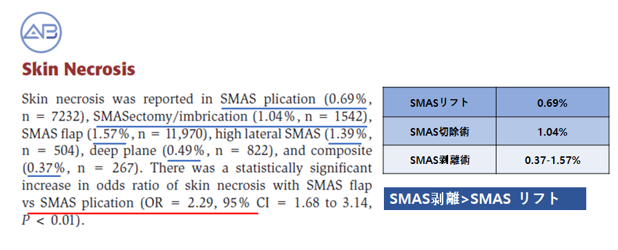 このとき、SMASリフト法と比較してSMAS剥離の場合、オッズ比が0.07〜0.46と統計学的に減少することが確認できます。これは個人的な意見ですが、徹底的で正確なSMAS剥離が血腫の副作用の確率を下げることができると考えています。