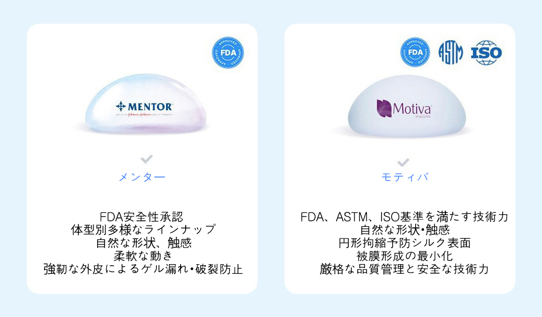 · メンター(Mentor):長い歴史を通じて安定性が立証されたプロテーゼです。 様々な種類のゲルと外皮を提供し、選択の幅が広く、アメリカFDAの承認を受けました。