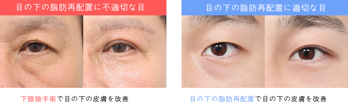 | 一方、目の下のシワを取る必要がある場合は目の下の脂肪再配置の効果が得られません。 |