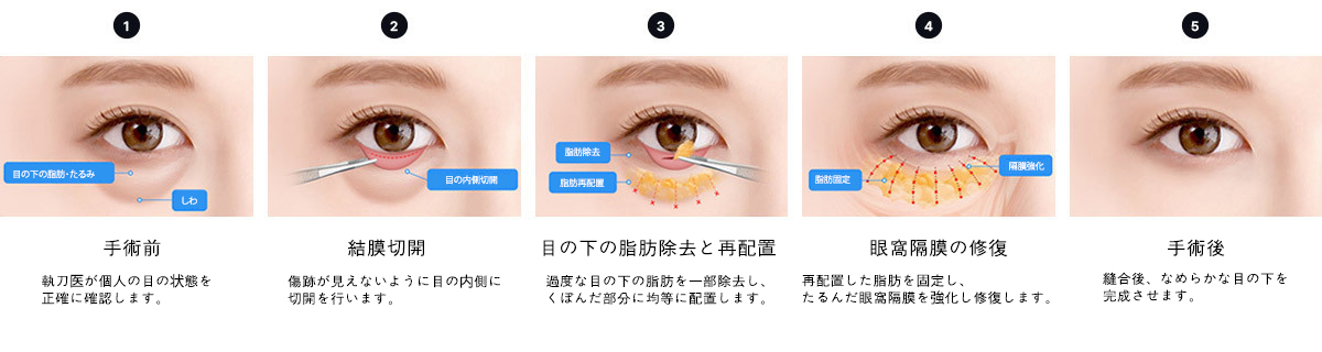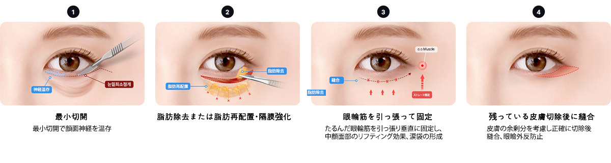 | 下眼瞼と目の下の脂肪再配置はどちらも眼の下部分の皮膚と筋肉を扱う手術ですが、違う目的と手術過程で行います。 |
