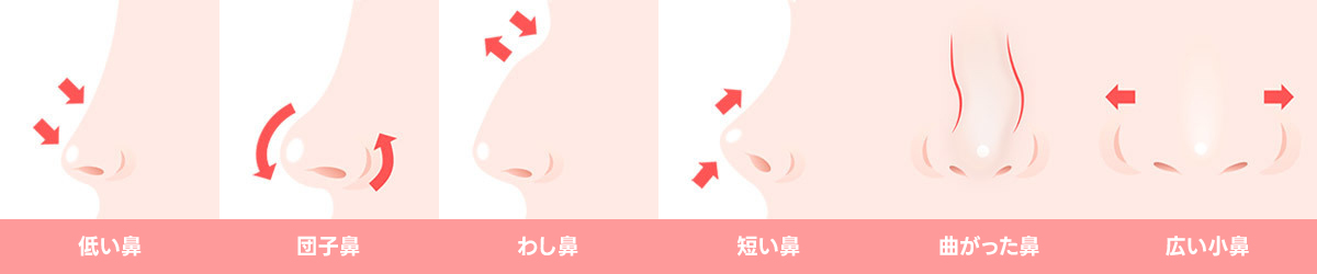 相談に来られた患者様が表現する「曲がった」は人によって違う表現の場合がございます。正面を基準に眉間を始点として鼻先までの鼻筋が直線ではなく、中間でどちらかに曲がっているのが一般的です。希に側面を基準にしてデコボコに曲がったわし鼻を「曲がった鼻」と表現する方もいらっしゃいます。鼻整形で曲がった鼻、わし鼻、低い鼻、短い鼻、団子鼻など、すべてのケースで矯正が可能なので、心配されなくても大丈夫です。
