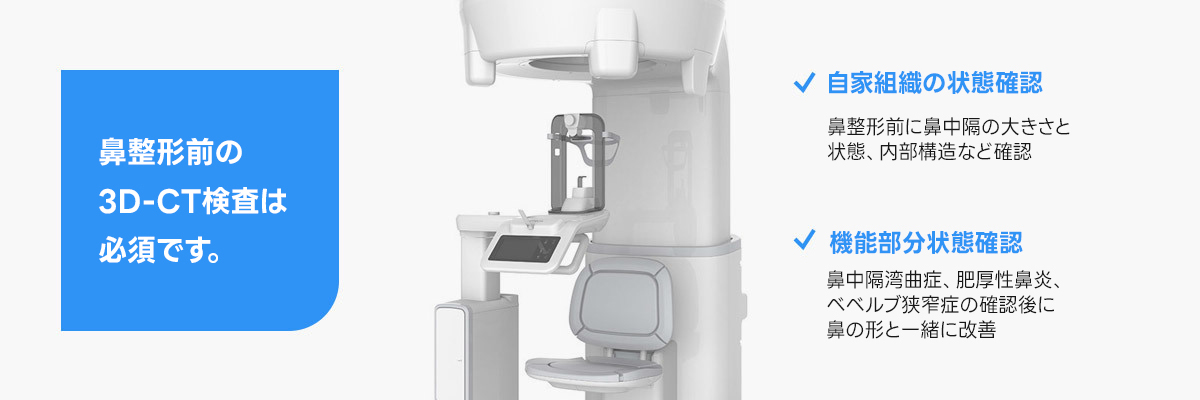 曲がった鼻を矯正したのにさらに曲がって見えたりする場合があるということです。このような場合には角度別写真や3D-CTを活用した多層撮影を通して顔の内外部の構造を比較して、自身の顔に一番合った鼻筋の方向を把握して鼻整形の計画を立てることが重要です。
