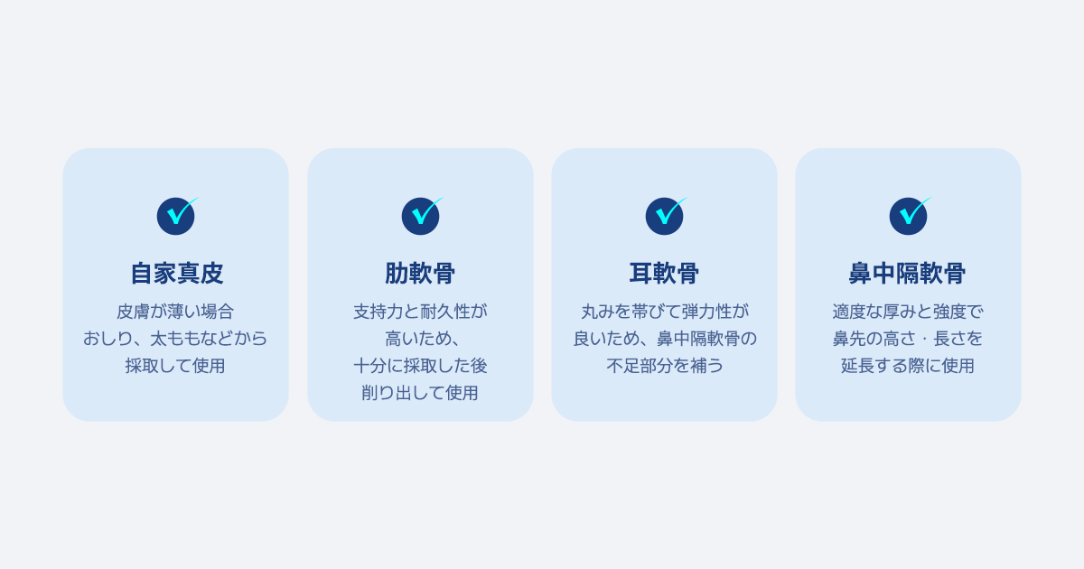 無プロテーゼ鼻整形は、人工物を使用せず、患者様ご自身の耳介軟骨・鼻中隔軟骨・自家肋軟骨などを用いて、自然で安全な鼻ラインを形成する手術方法です。