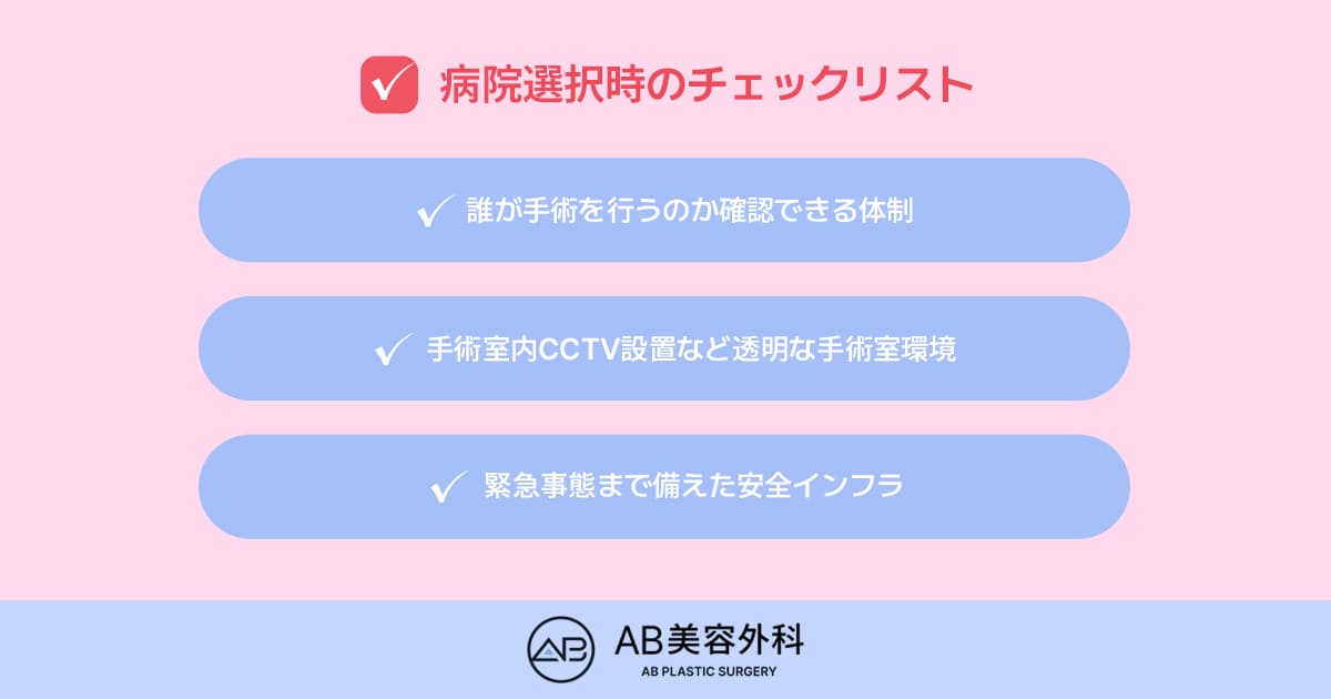 手術実名制、CCTV運用、麻酔科専門医常駐、緊急医療インフラなど、クリニックの運営体制をカウンセリング時に確認してください。