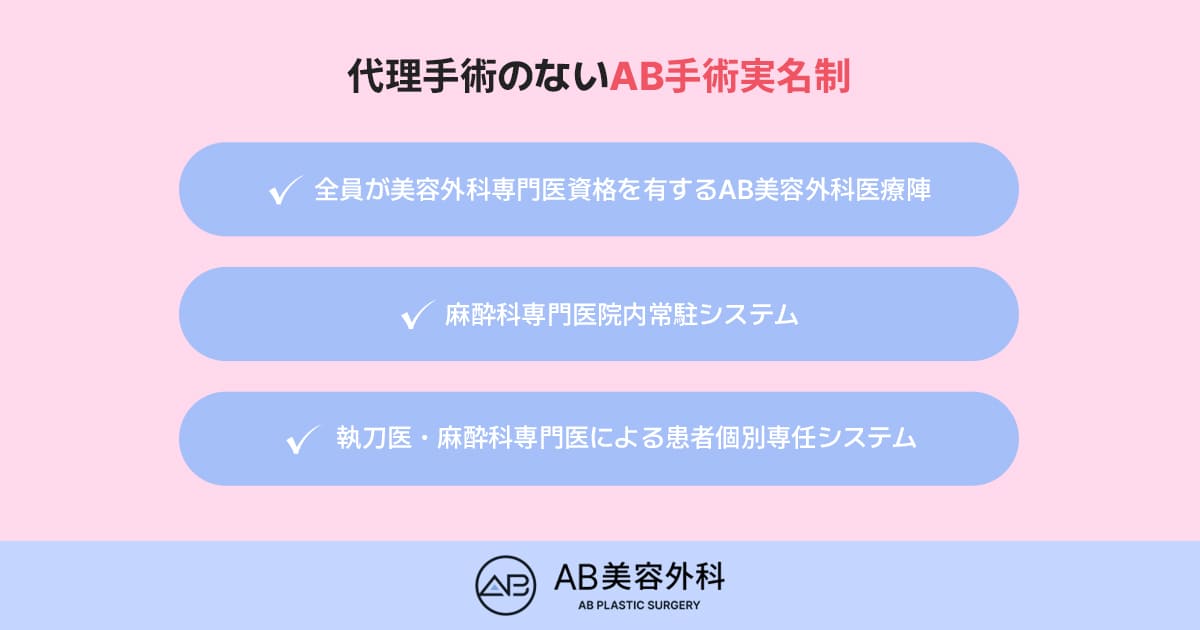 AB美容外科では、代理手術を防ぐために、安全で透明性の高い手術システムを運営しています。
