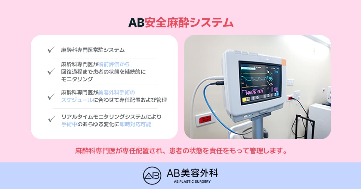一方、AB美容外科では麻酔科専門医が常駐しており、手術前評価から手術中・回復まで患者様の状態を継続的にモニタリングしています。