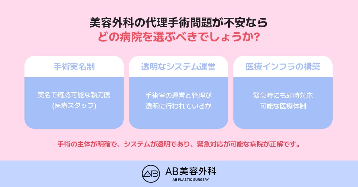 今回は、代理手術を防ぐために患者様が確認すべきポイントと、AB美容外科の安全システムを分かりやすく紹介します。