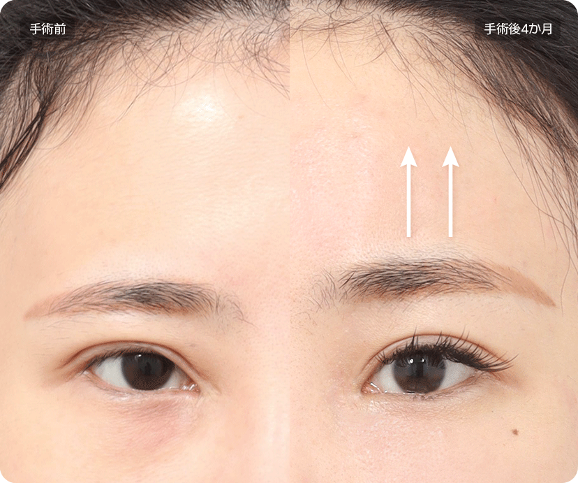 たるんだ眉と額を持ち上げ、眉と目の間の狭い間隔を広げ、すっきりした目元に改善します。